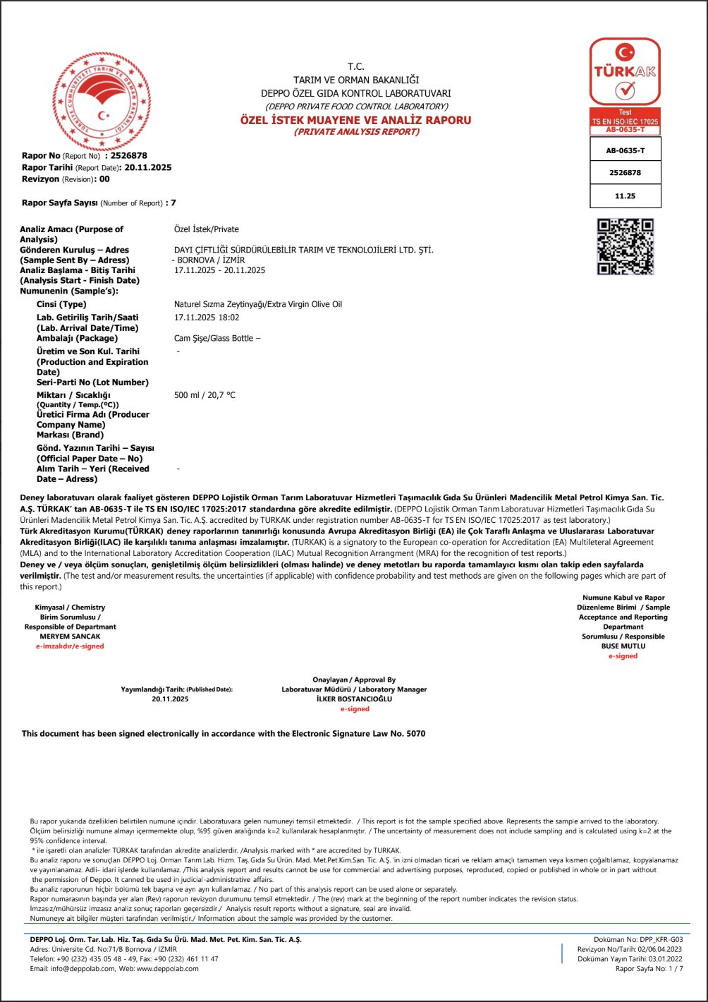 Dayı Çiftliği 2025 hasat sezonu Naturel Sızma Zeytinyağı analiz sonuçları, ürünümüzün yalnızca bir gıda değil, aynı zamanda yüksek standartlara sahip bir sağlık iksiri olduğunu bilimsel olarak tescillemiştir. Tarım ve Orman Bakanlığı onaylı Deppo Özel Gıda Kontrol Laboratuvarı tarafından 20 Kasım 2025 tarihinde düzenlenen rapor, zeytinyağımızın uluslararası premium segment standartlarına tam uyum sağladığını göstermektedir.